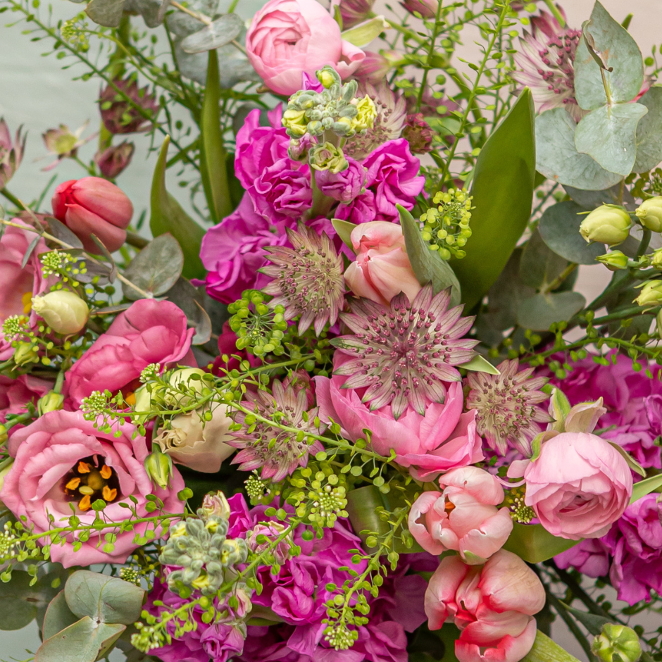 tulipes roses, astrantia roses, giroflées roses, lisianthus roses, renoncules roses, feuillage divers
